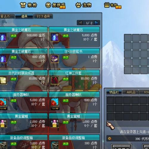 商城有1金币的新手礼包-礼包打开有经验书-可直升33级 8个100%天空合成器(购买16个单件时装合成一套天空) -以及+10强化卷和一些道具