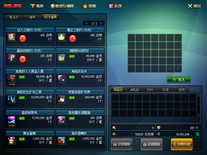 新人上线系统送 5 万代币券,除需要点券金币购买,其他都可以用代币券购买。