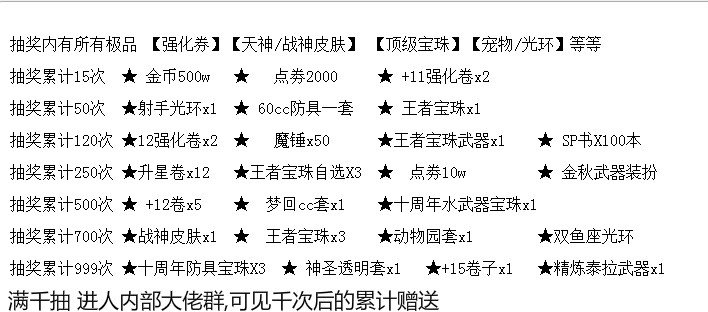 !!!! 快速发展:直接抽奖 群里 打字 发出抽奖 点击链接 3元抽奖 可获得+15强化卷 梦回装备(属性不错哦)各自称号 皮肤 光环 宠物 !!!!