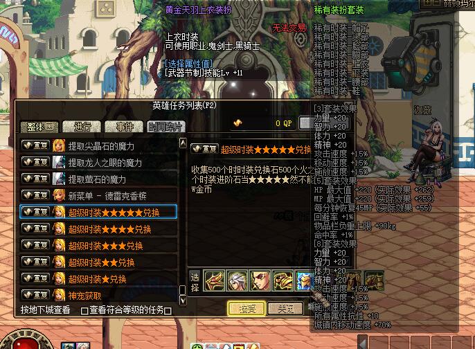 超级时装:所有等级时装,完成1次 获得一件!可选择做提升最大的单件搭配!因为所有天空套装属性无任何区别!区别只在于单件!做超1或超5自己选择!切记,一次完成获得单件!