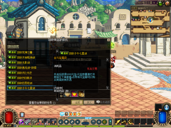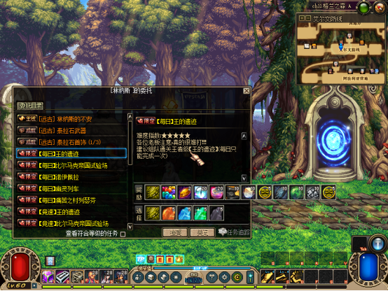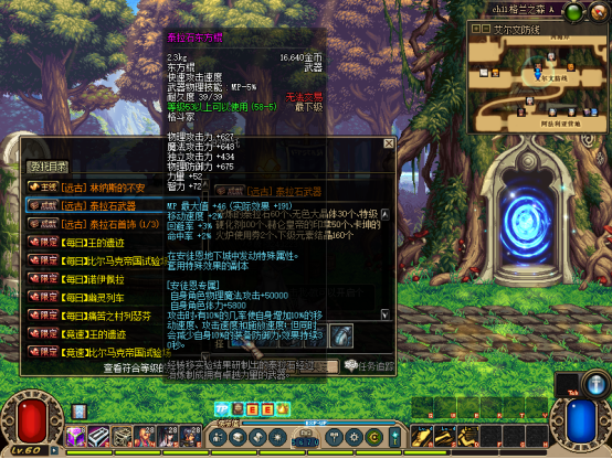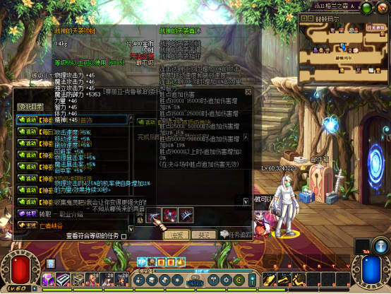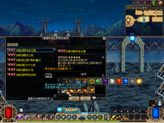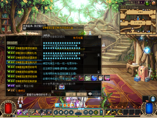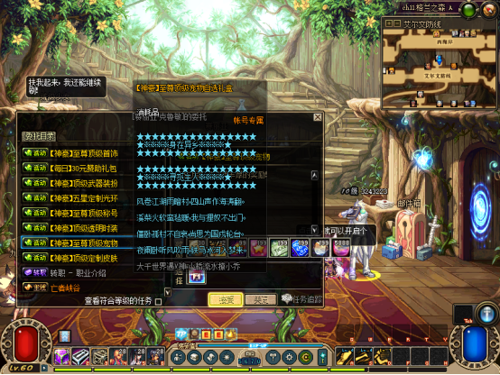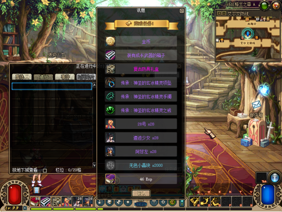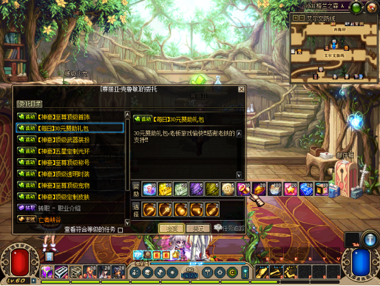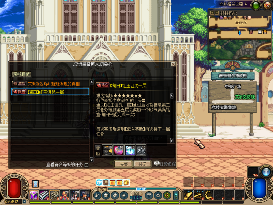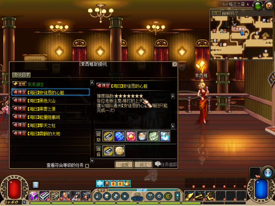 然后完成赛利亚【初次见面】任务!可获得一堆奖励,把装备带上,吃30倍经验药水可以去刷图升级了【不想手动升级可在商场购买60级满级券】